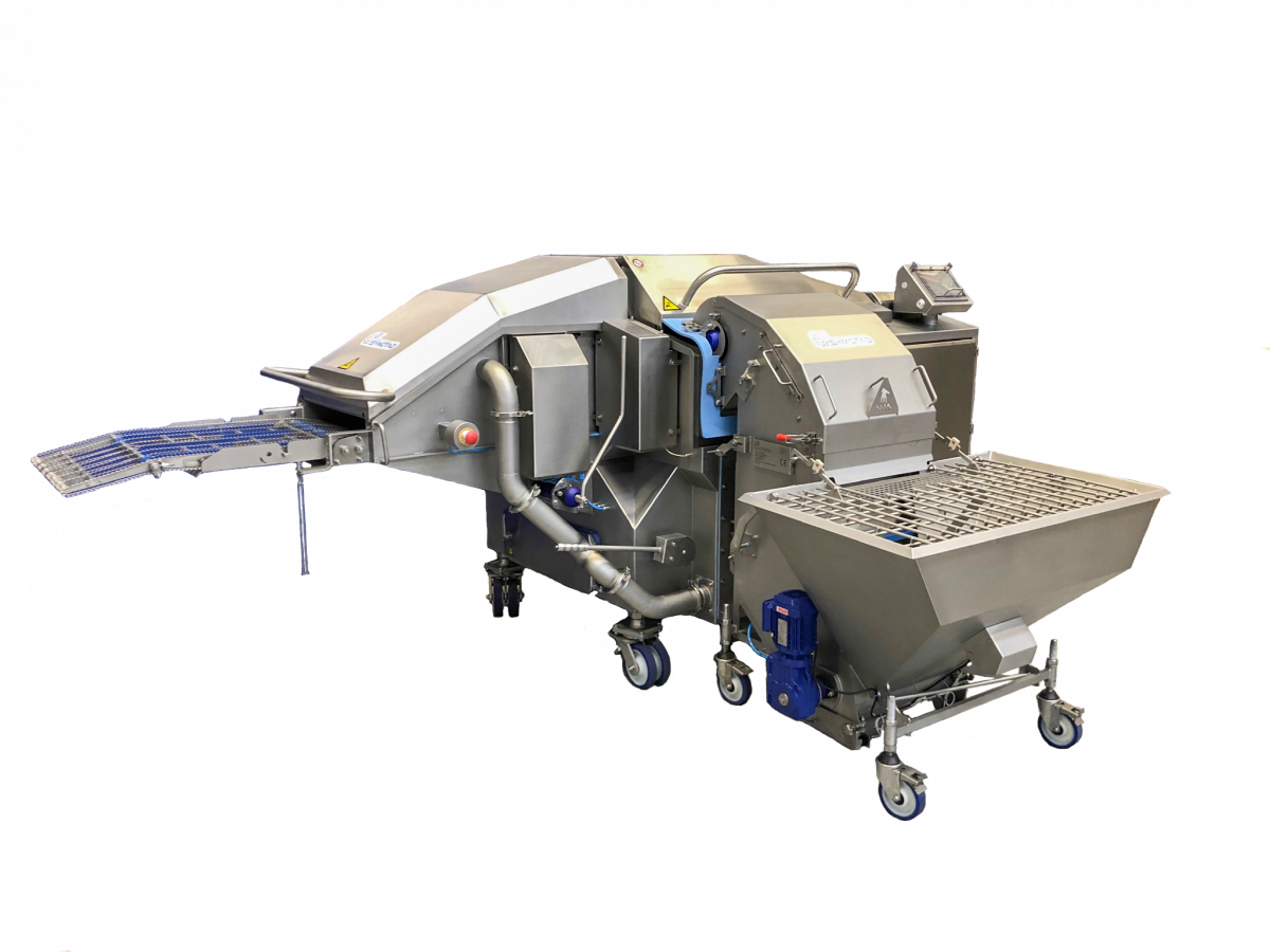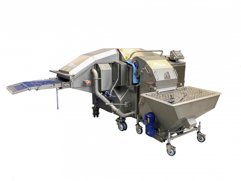Combo Coater in drum mode. At the exit of the drum 4 spreader arms wipe tenders, strips, wings, potato chips, shrimps, mushrooms or cauliflower and many others over the entire width of the belt.